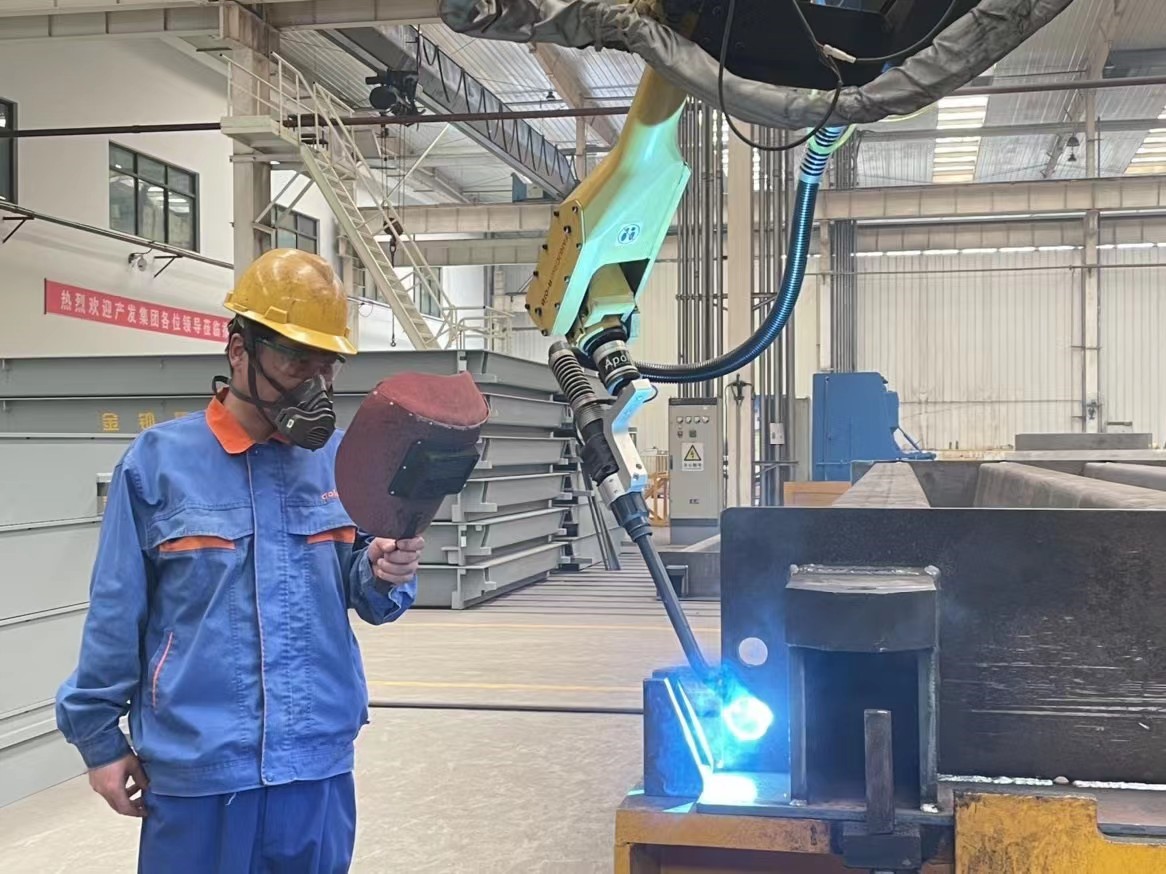 金鐘研發(fā)部門為提升汽車衡秤臺(tái)的承重強(qiáng)度,新設(shè)計(jì)了U型梁結(jié)構(gòu),經(jīng)過(guò)試制和不斷推廣,訂單逐步增加,汽車衡班的工作壓力也不斷加大,而汽車衡的稱臺(tái)焊接成為了制約工作效率的瓶頸。為了能夠按時(shí)保質(zhì)完成生產(chǎn)任務(wù),黨支部組織成立“黨員編程突擊隊(duì)”,由黨員張慶力任隊(duì)長(zhǎng),突擊隊(duì)成員發(fā)揮模范帶頭作用,發(fā)揚(yáng)匠心精神,成功解決了“汽車衡自動(dòng)化焊接編程”和自動(dòng)焊機(jī)在平臺(tái)底部尋位不準(zhǔn)難題,最大限度地提高焊接機(jī)器人的效率。